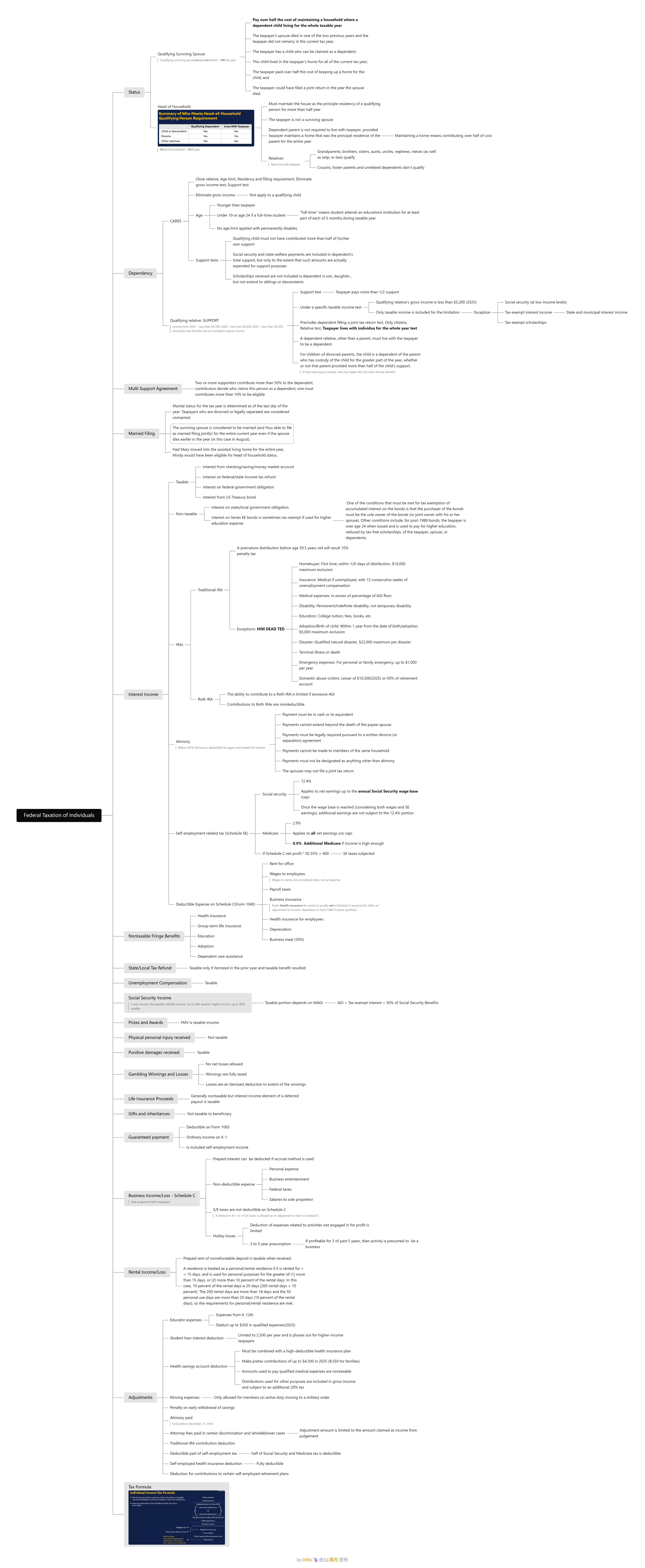 Gross Income − Adjustments (above-the-line deductions)= Adjusted Gross Income (AGI) − Standard or Itemized Deductions= Taxable Income × Tax Rate= Tax Liability − Credits= Taxes Owed